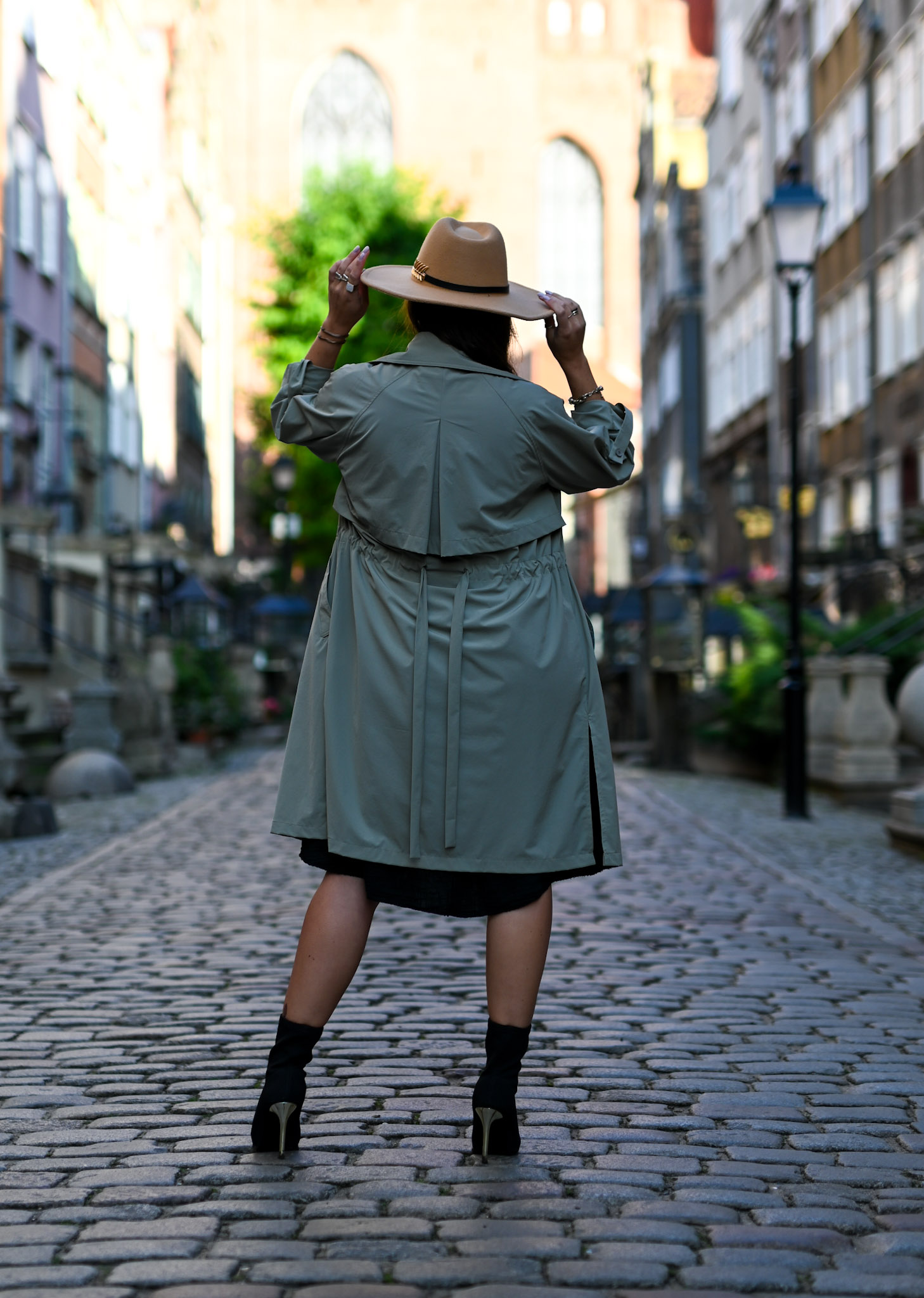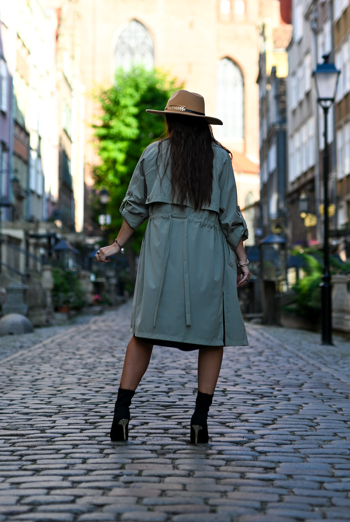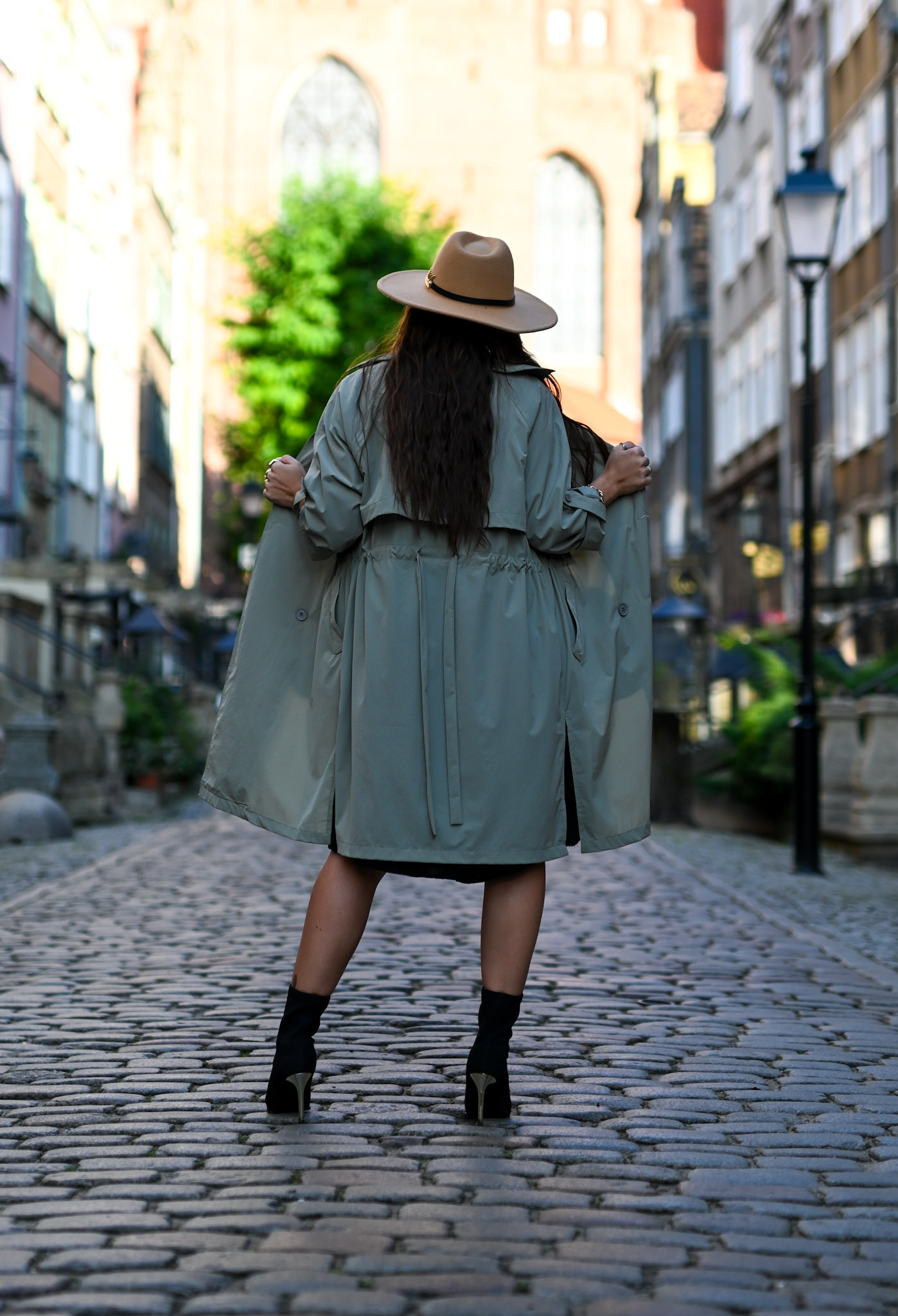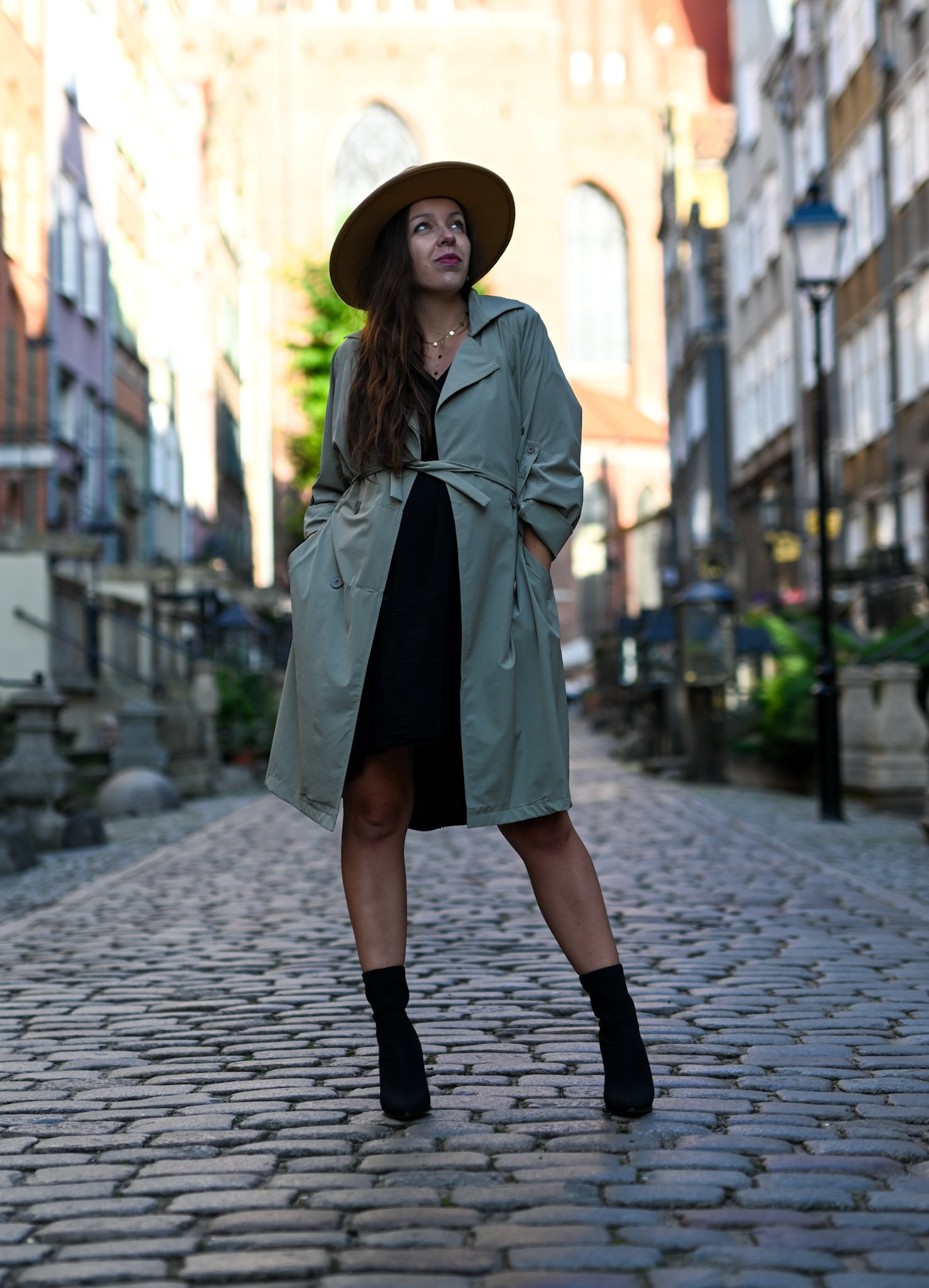 Długi trencz w pięknym przygaszonym kolorze khaki. Płaszczyk świetnie sprawdzi się jako narzutka na jesienne dni. Model ten jest zapinany na dwurzędowe guziki, posiada długie rękawy ale pięknie prezentuje się z podwiniętym rękawami 3/4 (posiada dodatkowy guziczek przy rękawie). Płaszczyk ma wiązanie w talii oraz dwie kieszenie po bokach. Wiązanie możemy ściągnąć z tyłu lub zawiązać z przodu aby podkreślić talię.
