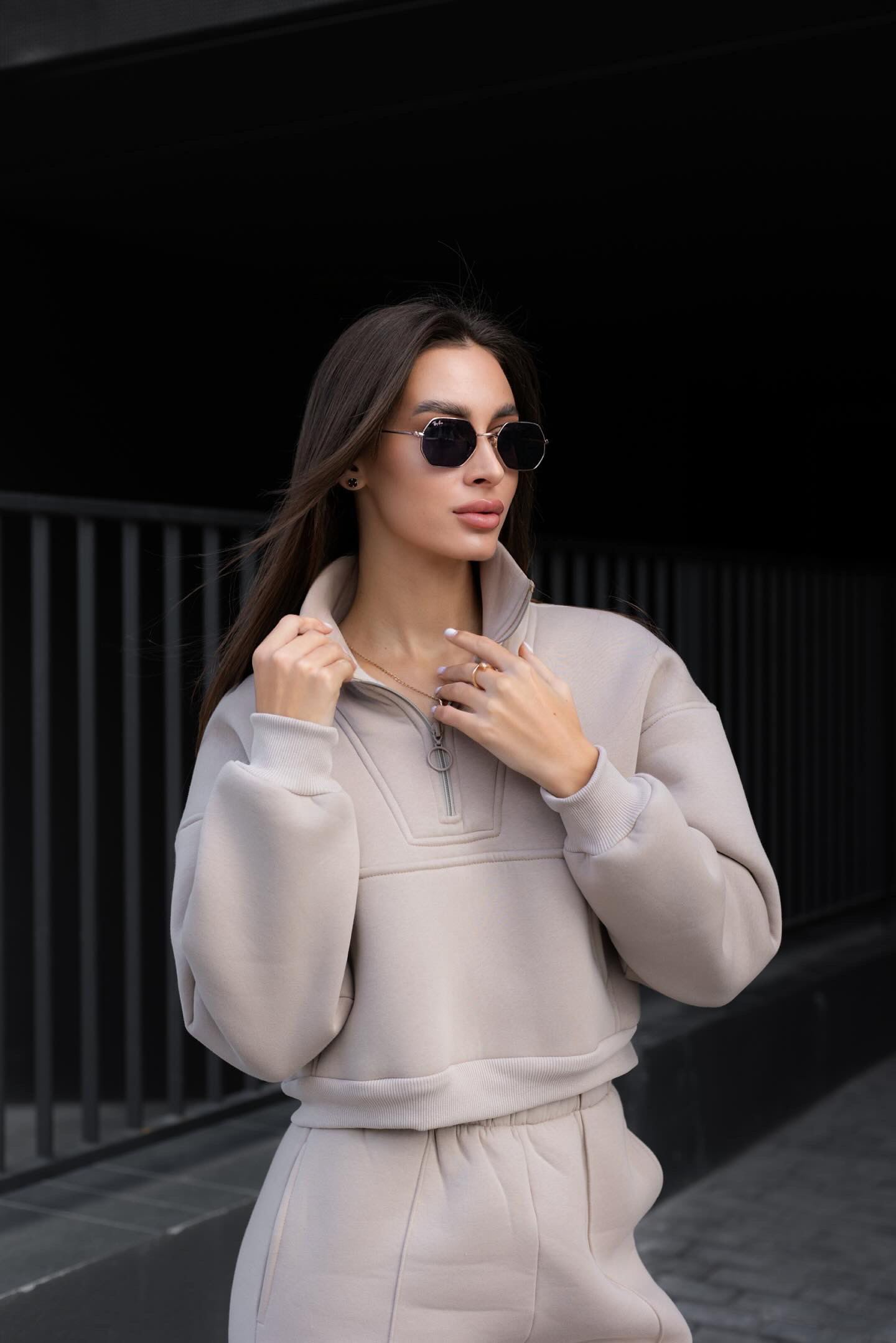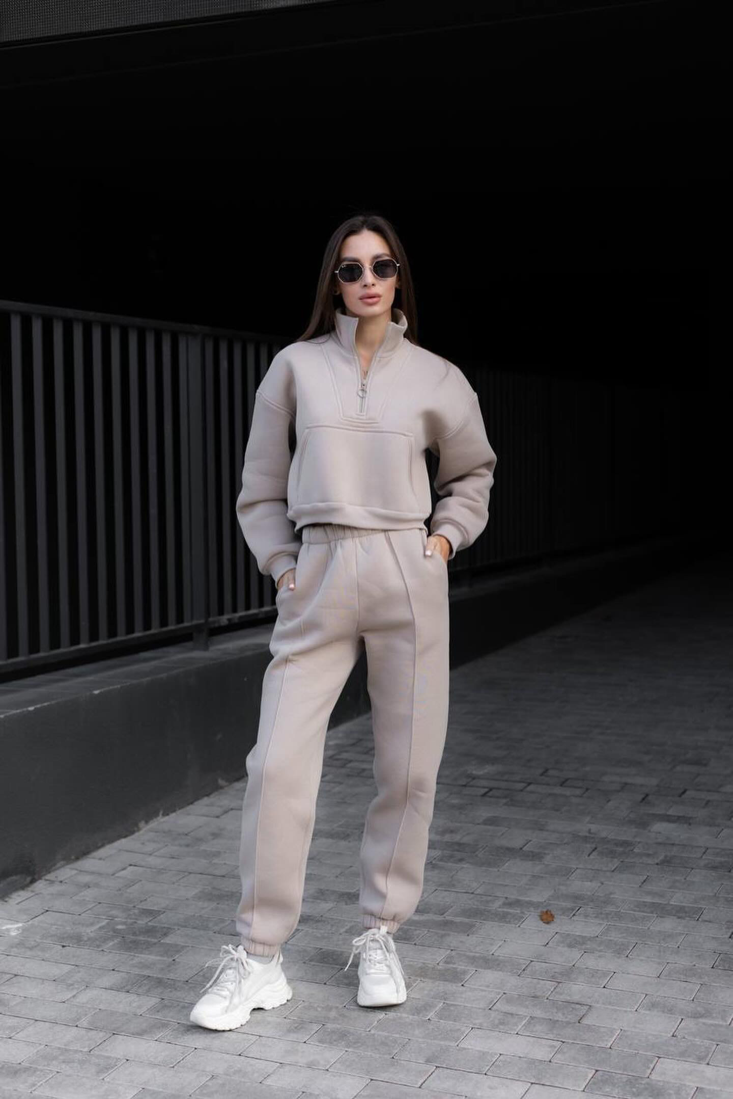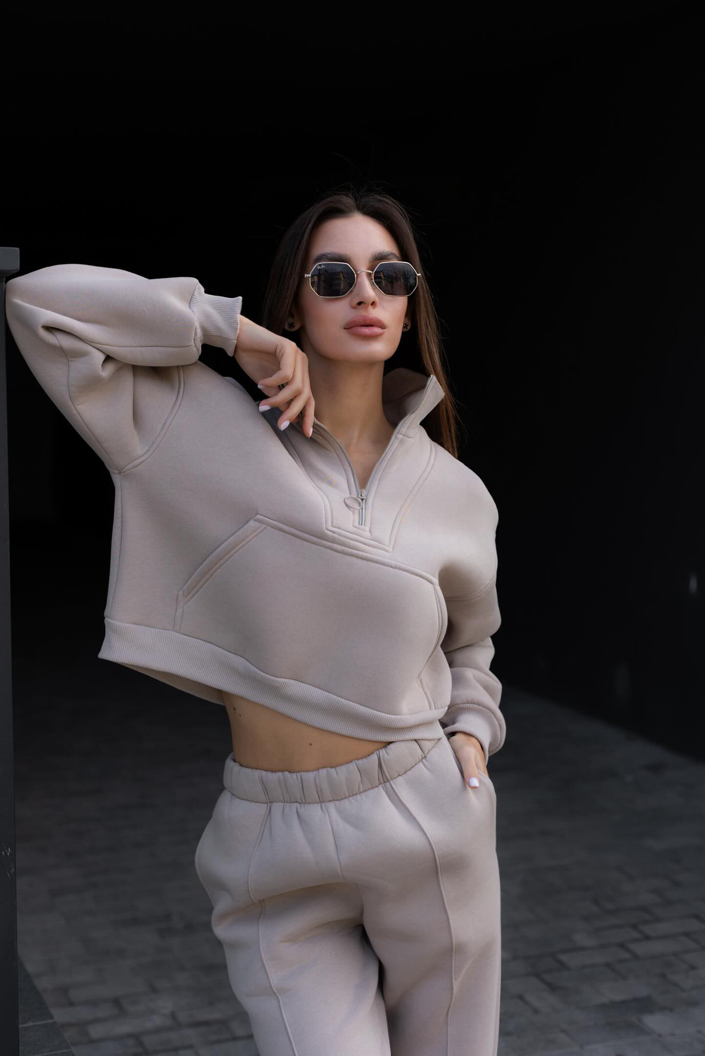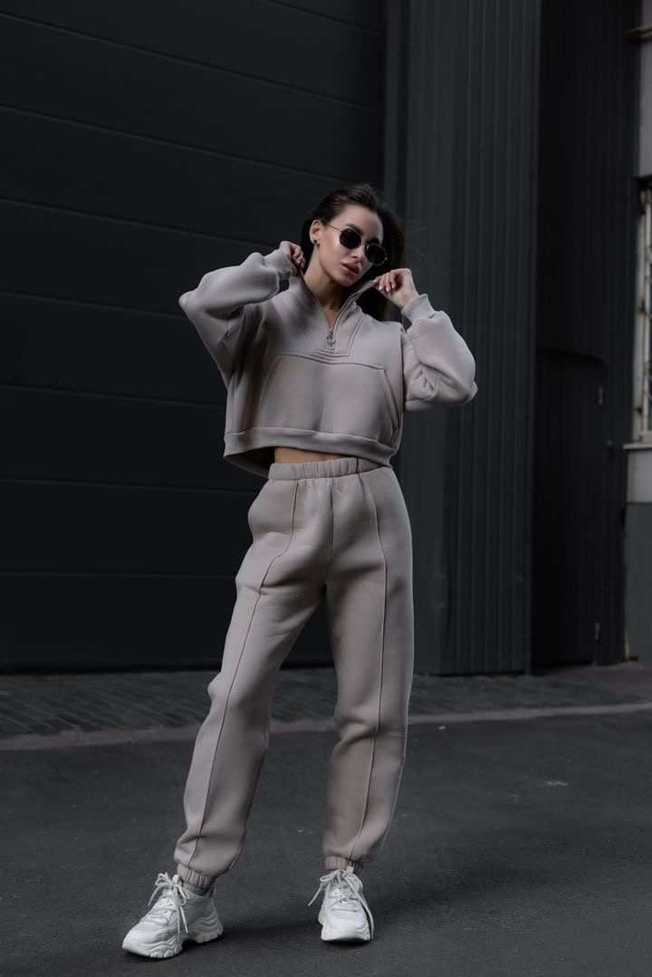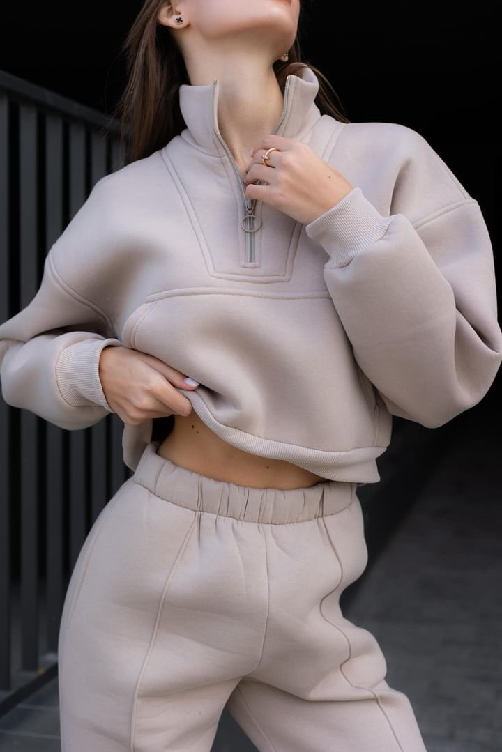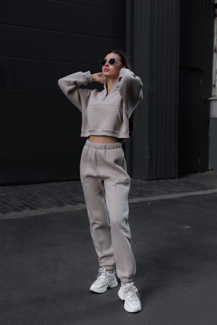 Ciepły komplet dresowy składający się z krótkiej luźniejszej bluzy oraz długich spodni. Bluza zapinana na biuście na zameczek, spodnie na gumce z dwiema kieszeniami. Materiał jest cieplejszy, od środka otulony milutkim do ciała misiem 🙂 Ten Idealny na chłodne dni komplet dostępny jest w kilku wariantach kolorystycznych. Który wybierzesz? <3 Modelka ma na sobie rozmiar S i 175 cm wzrostu. Komplet z serii PREMIUM, szyty w Polsce.