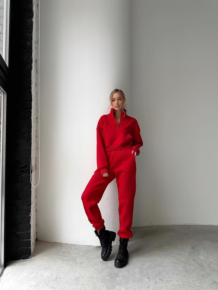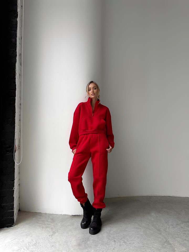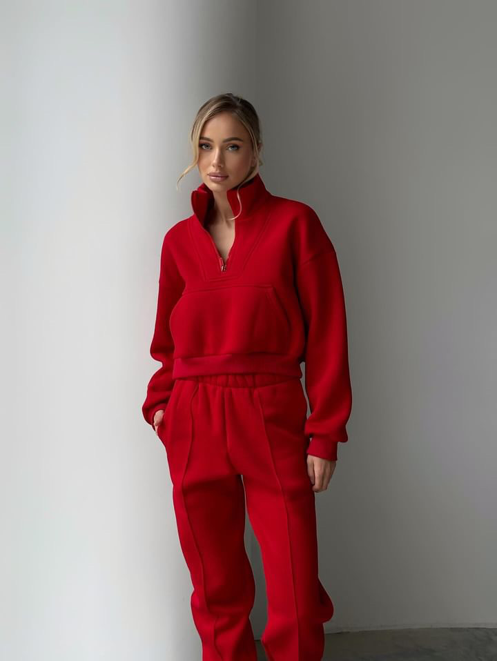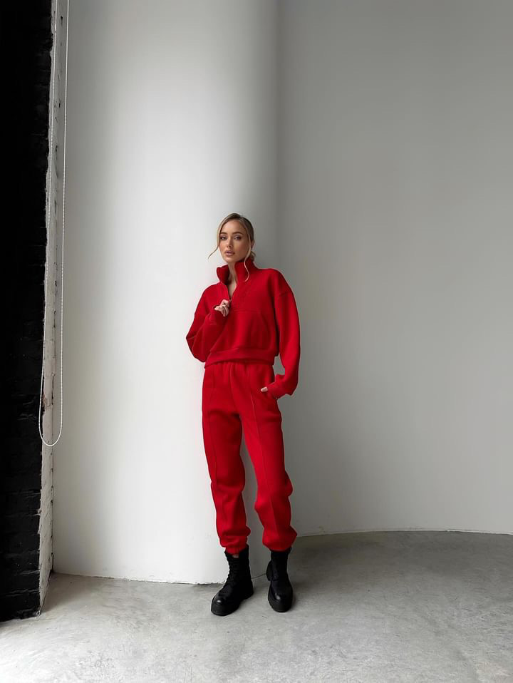 Ciepły komplet dresowy składający się z krótkiej luźniejszej bluzy oraz długich spodni. Bluza zapinana na biuście na zameczek, spodnie na gumce z dwiema kieszeniami. Materiał jest cieplejszy, od środka otulony milutkim do ciała misiem 🙂 Ten Idealny na chłodne dni komplet dostępny jest w kilku wariantach kolorystycznych. Który wybierzesz? <3 Modelka ma na sobie rozmiar S i 170 cm wzrostu. Komplet z serii PREMIUM, szyty w Polsce.
