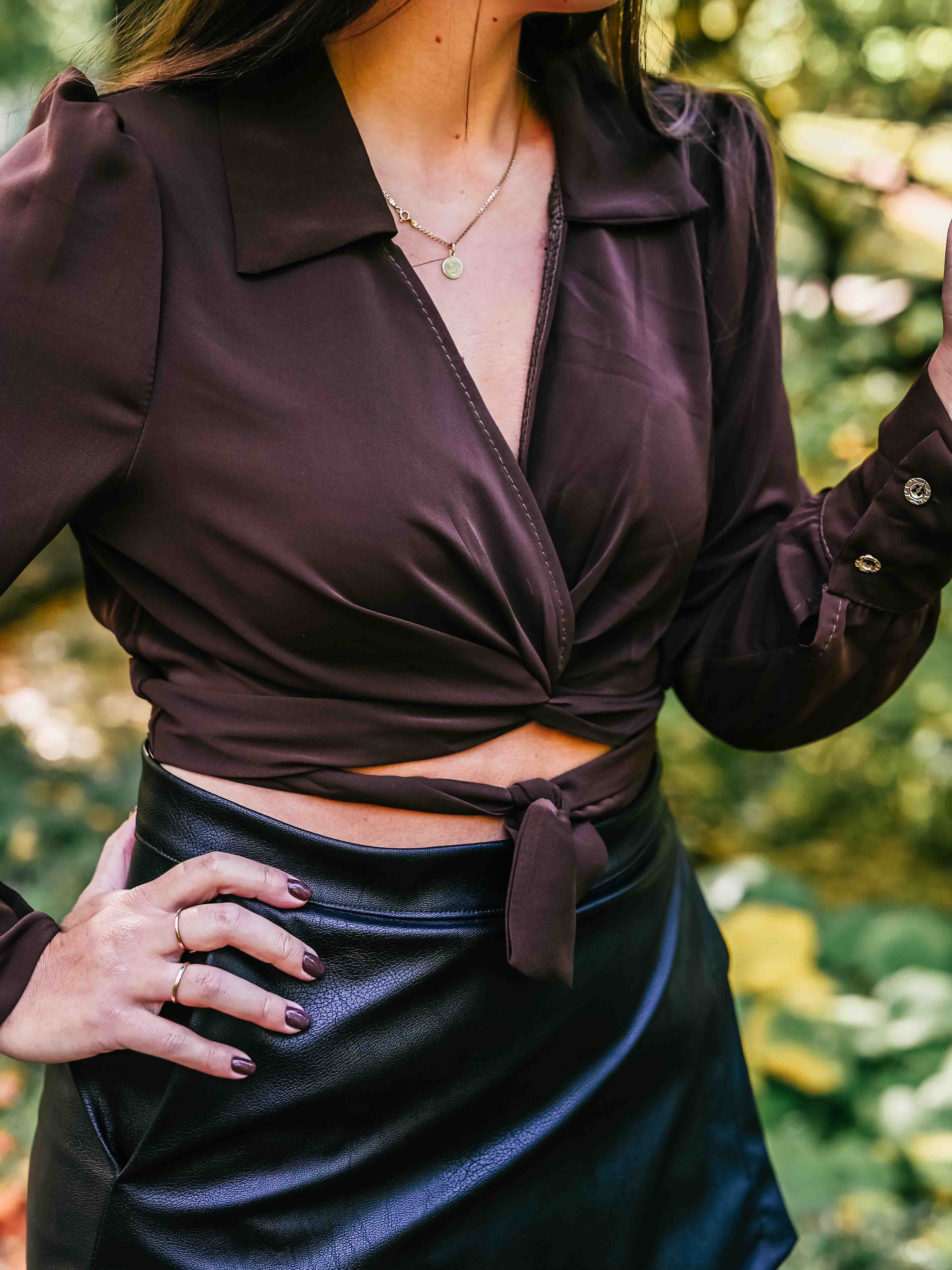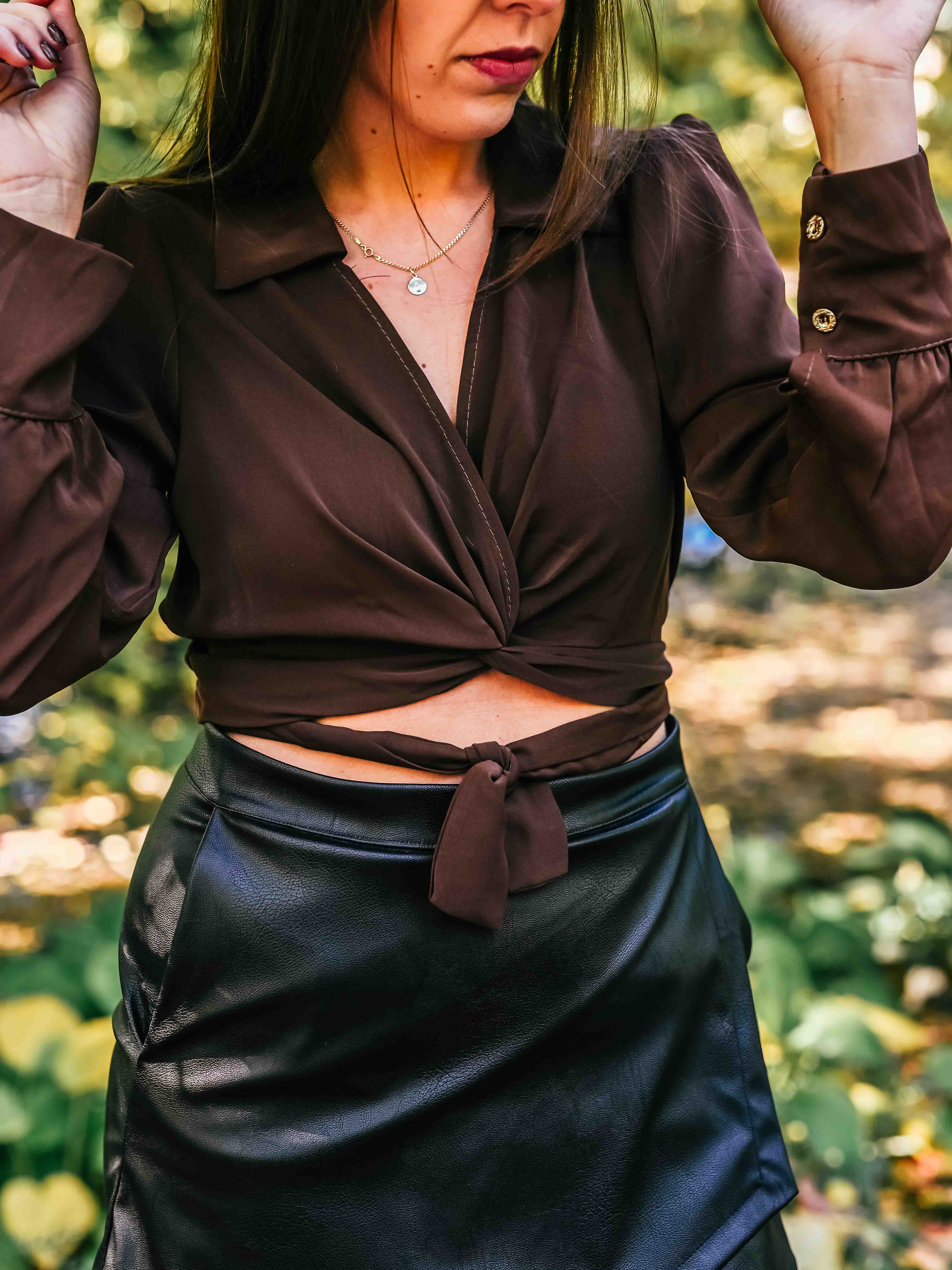 Ta elegancka krótka koszula przewiązywana w pasie cudownie podkreśli Twoją talię, piękną kokardę możesz zawiązać zarówno z przodu jak i z tyłu. Bardzo modny fason tego sezonu, idealnie współgra ze spódniczką bądź spodniami z wyższym stanem. Mankiety koszuli ozdabiają guziczki w złotym kolorze.