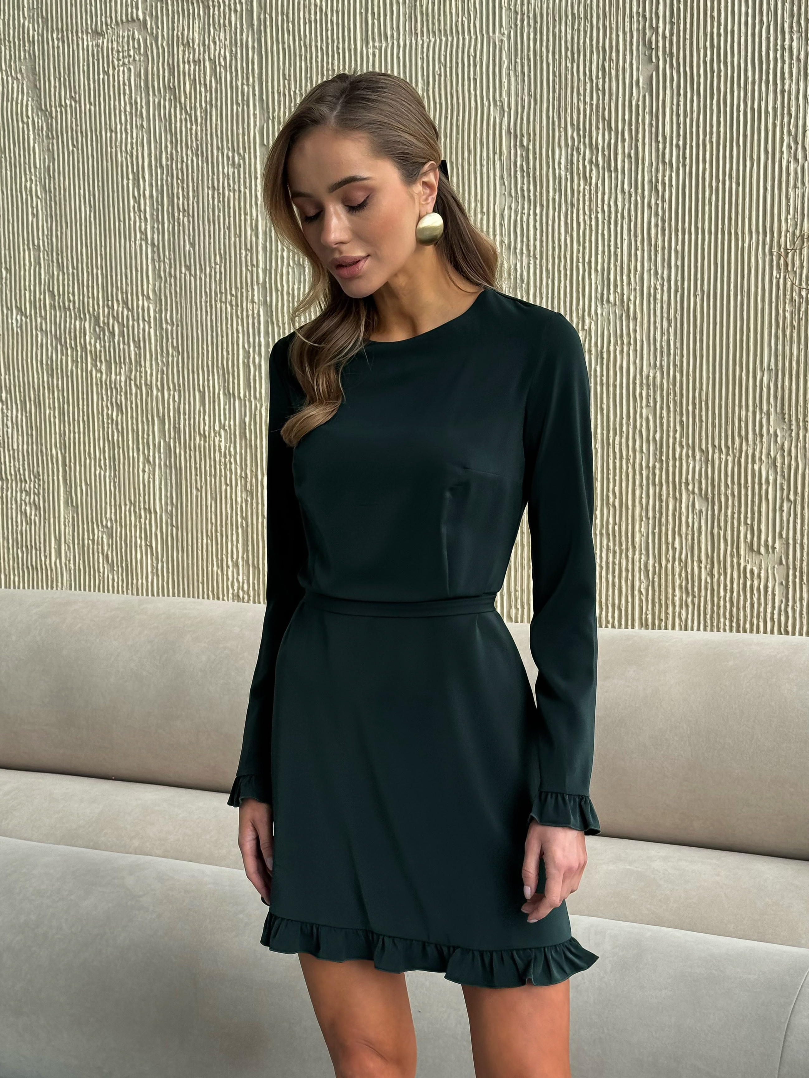 Minimalistyczny krój z paseczkiem w talii został przełamany dziewczęcą falbanką przy dole i mankietach, a długość mini nadaje całości lekkości i charakteru.