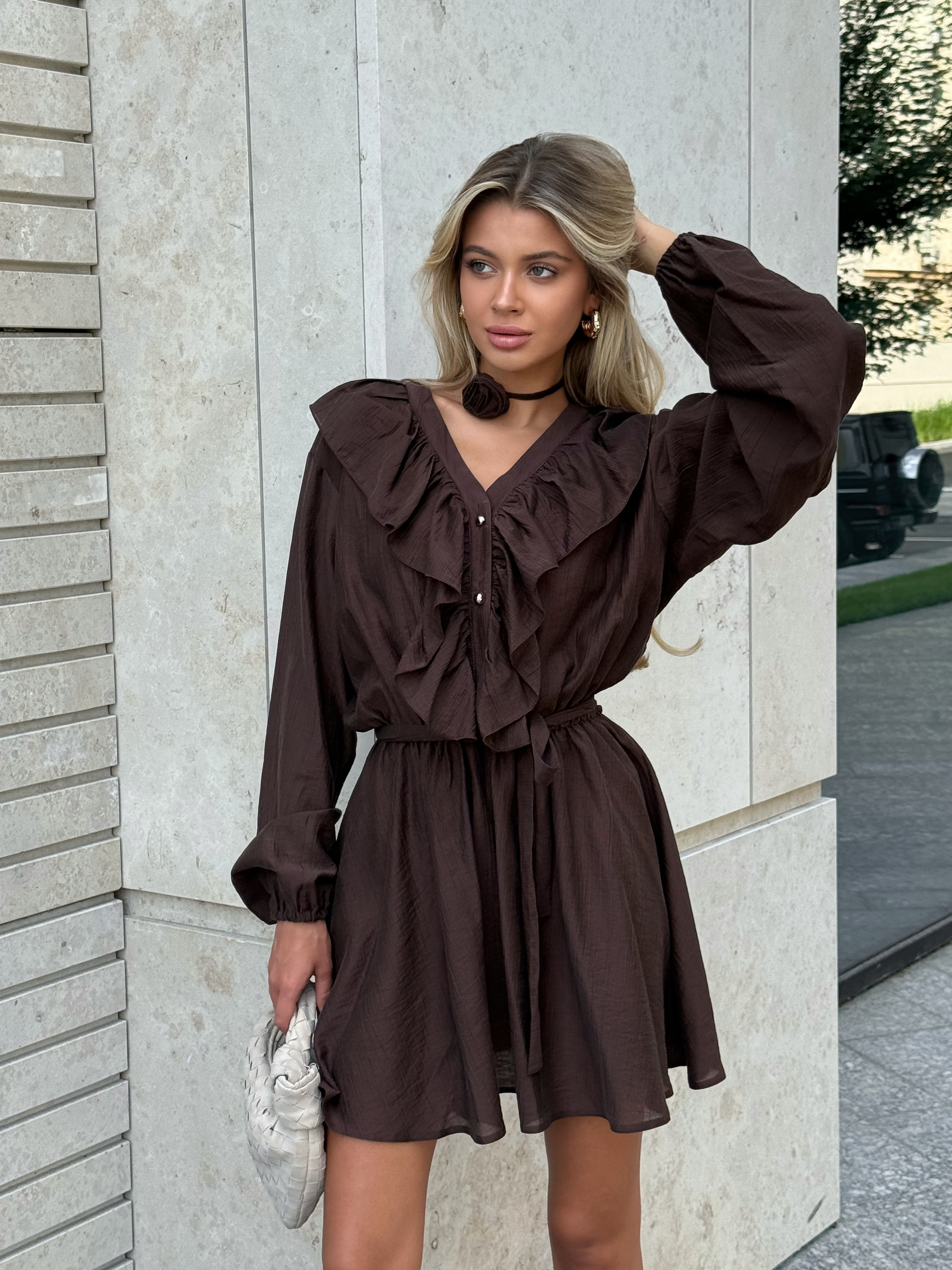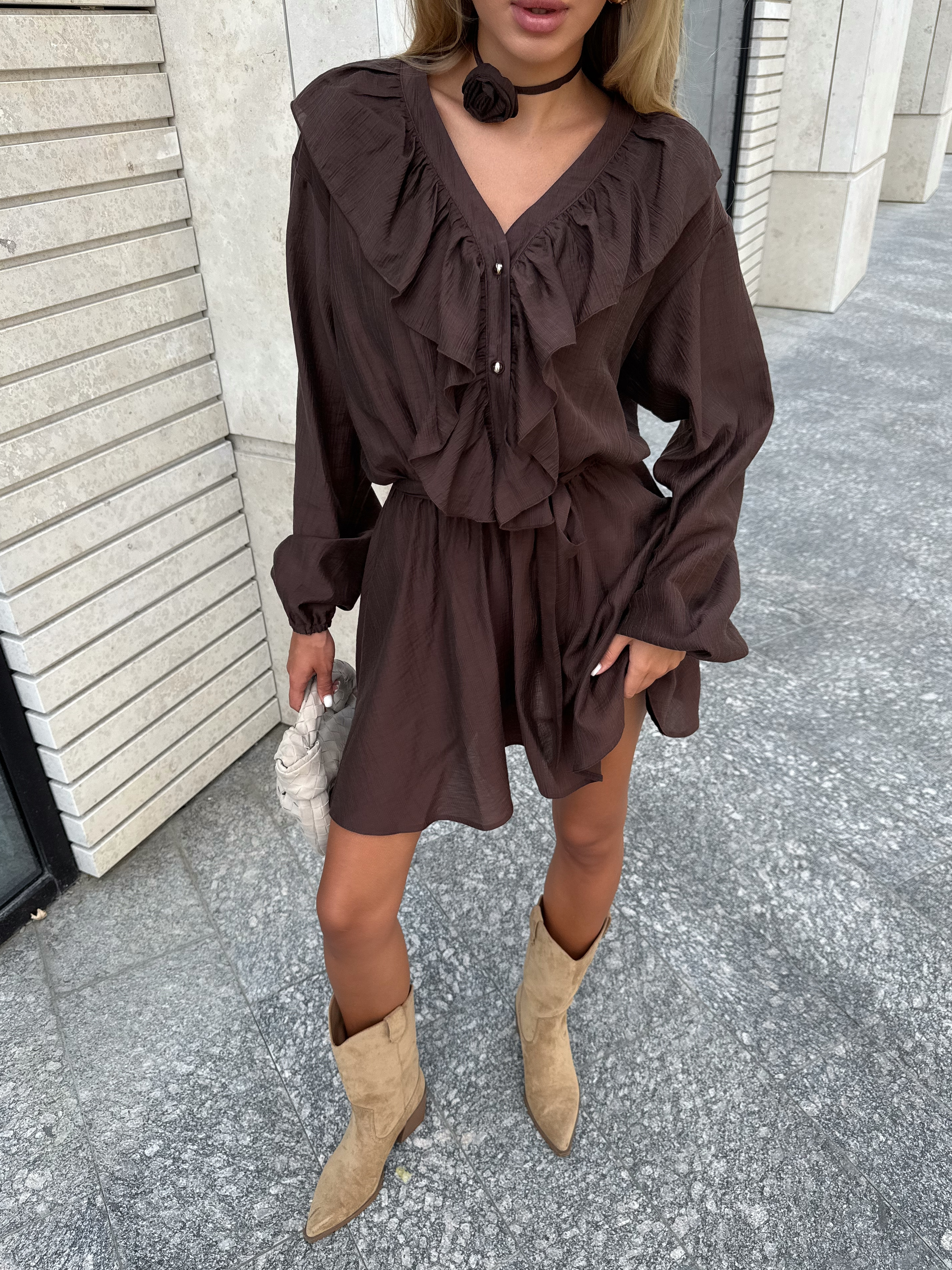 Wyjątkowa i pełna romantycznej aury. Sukienka w głębokim, czekoladowym odcieniu zachwyca subtelną zwiewną formą i delikatną aplikacją w postaci róży, która nadaje jej kobiecości. Sukienka uszyta z przewiewnej tkaniny, posiada głęboki dekolt w serek, romantyczne falbany na piersiach, długie, lekko rozszerzane rękawy i pasek podkreślający talię