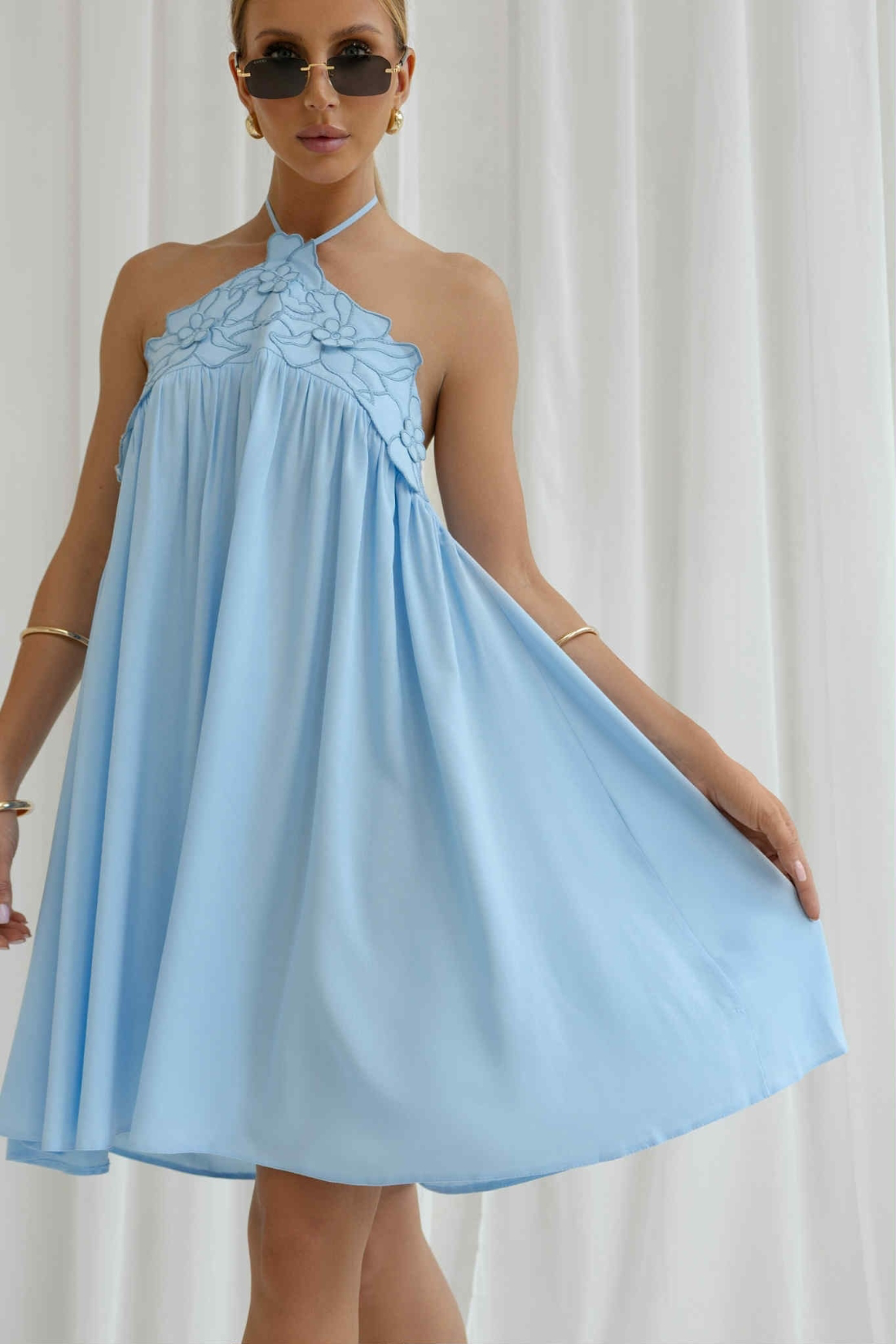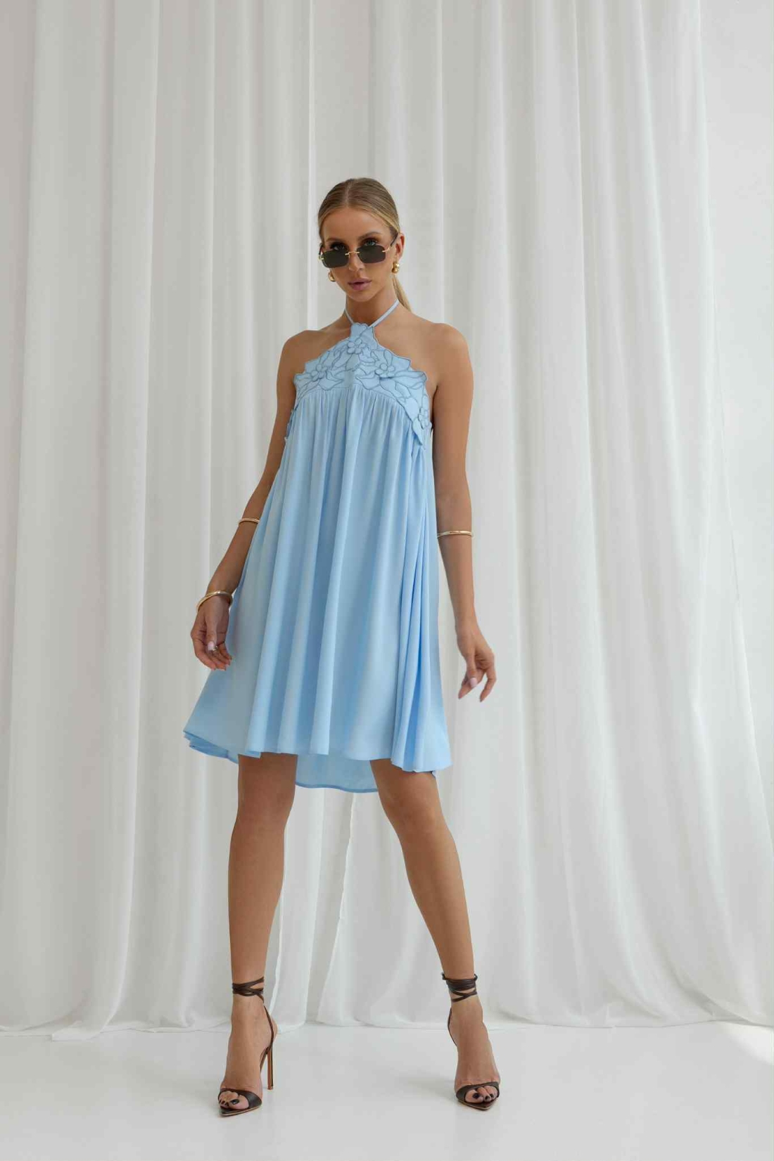 Zanurz się w letnim błękicie z naszą wyjątkową sukienką o luźnym fasonie i zmysłowym halter neck. Subtelny haft przy dekolcie dodaje lekkości i romantyzmu, a zwiewny materiał pięknie pracuje w ruchu. To model, który doskonale sprawdzi się zarówno na wakacyjnym wyjeździe, jak i podczas letnich przyjęć w ogrodzie, na przyjęciu weselnym czy baby shower. Sukienka idealna na ciążowy brzuszek. Sukienka z tyłu na górze pleców posiada gumeczkę.