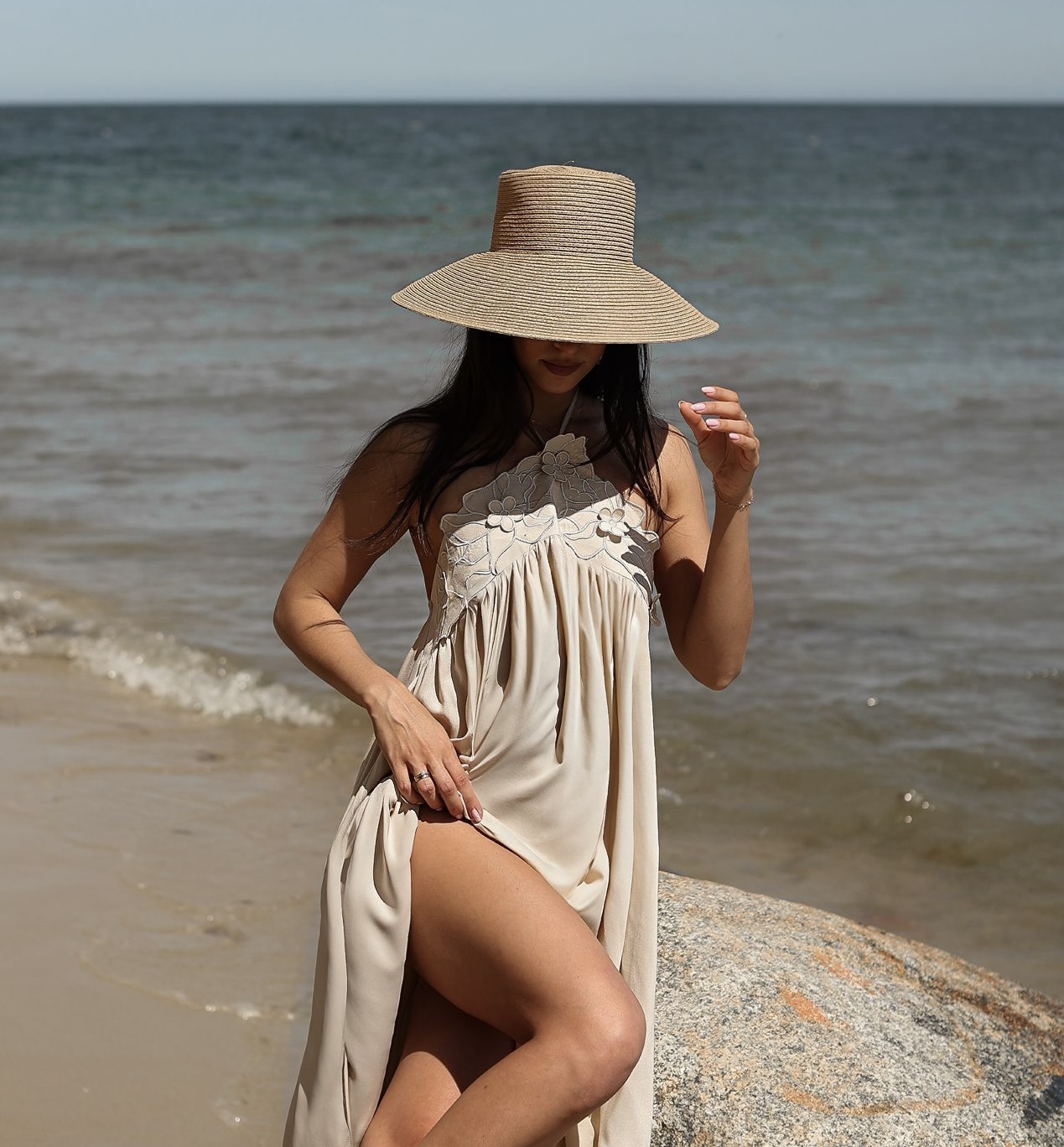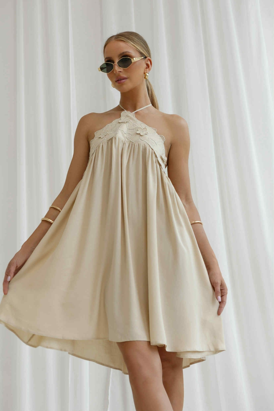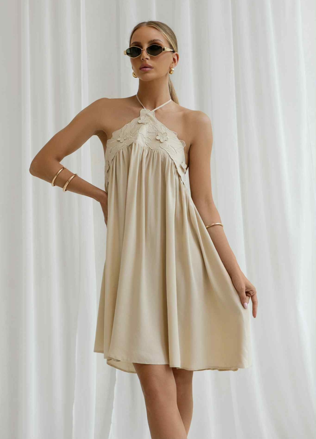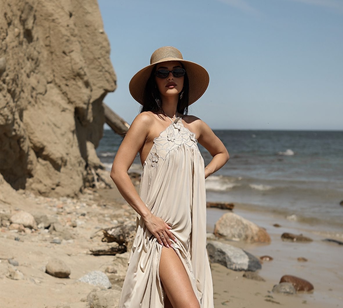 Zanurz się w letnim błękicie z naszą wyjątkową sukienką o luźnym fasonie i zmysłowym halter neck. Subtelny haft przy dekolcie dodaje lekkości i romantyzmu, a zwiewny materiał pięknie pracuje w ruchu. To model, który doskonale sprawdzi się zarówno na wakacyjnym wyjeździe, jak i podczas letnich przyjęć w ogrodzie, na przyjęciu weselnym czy baby shower. Sukienka idealna na ciążowy brzuszek. Sukienka z tyłu na górze pleców posiada gumeczkę.