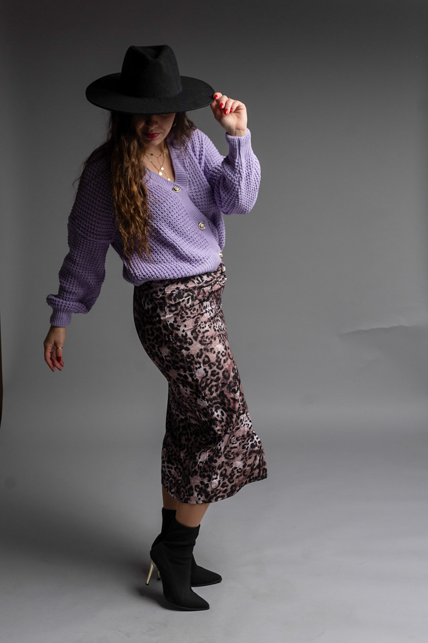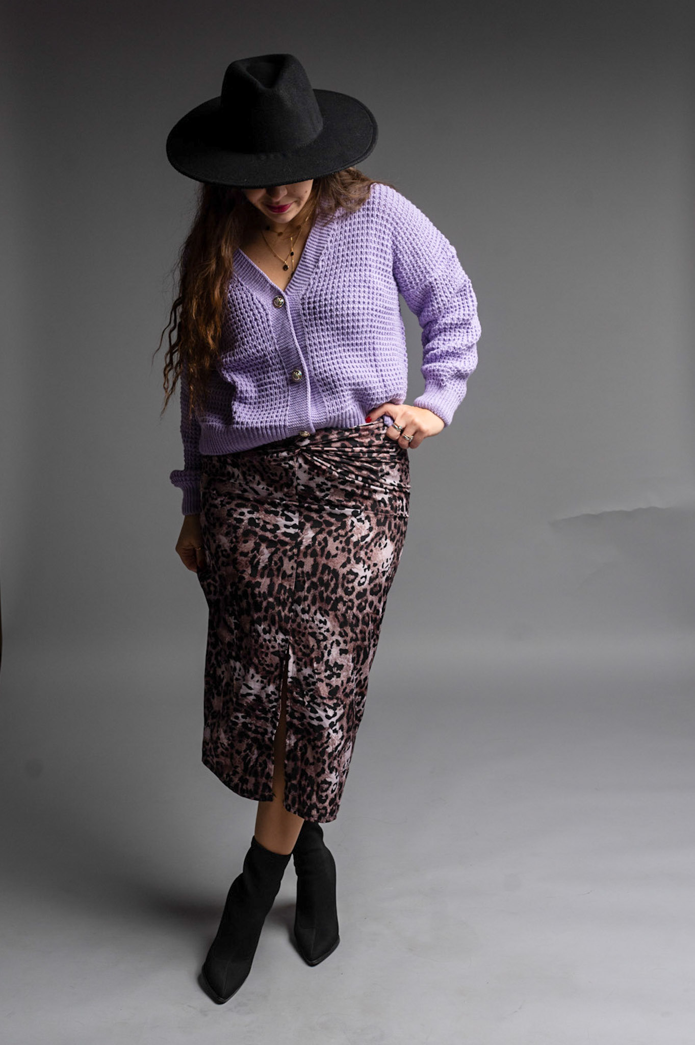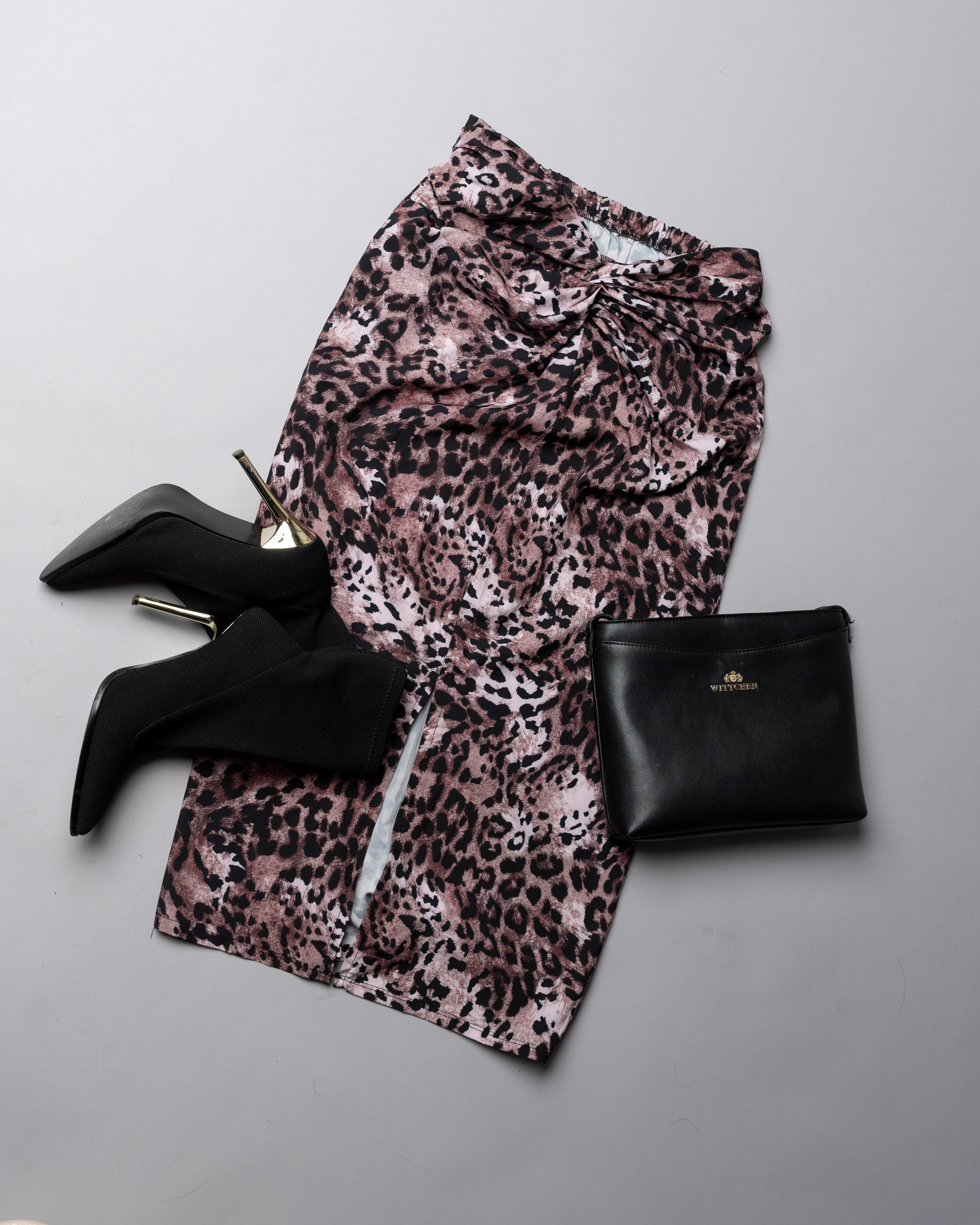 Spódnica midi o drapieżnym wzorze. Posiada delikatny rozporek, marszczenie z przodu, oraz gumeczkę z tyłu w pasie. Piękna baza do stylizacji na co dzień z cieplejszym sweterkiem lub bardziej kusząco z dopasowanym body.