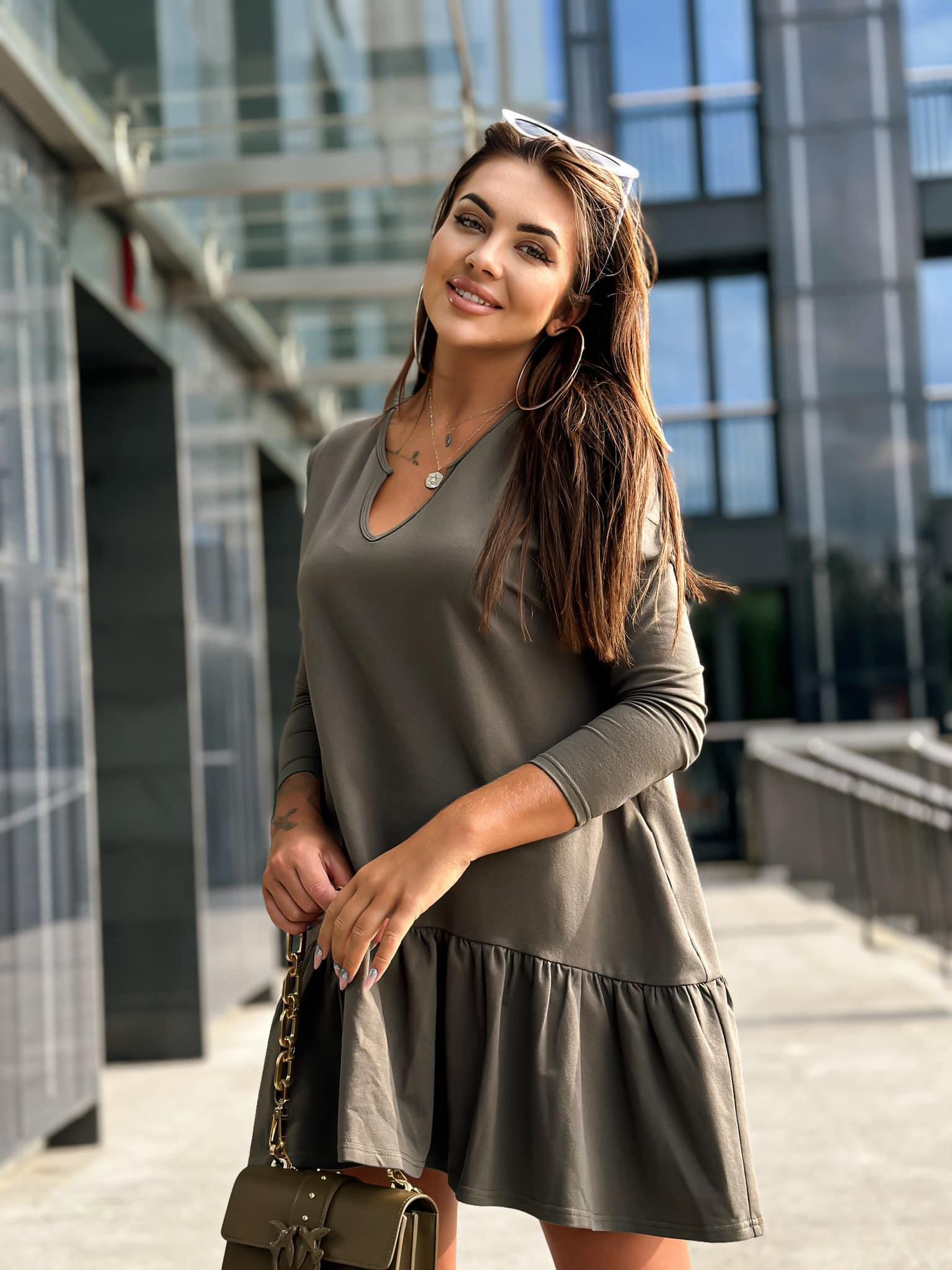 Sukienka oversize zakończona u dołu piękną szeroką falbaną. Krój w literę A w pięknym jesiennym kolorze. Sukienka bawełniana Polskiej Produkcji, jakość Premium, posiada ukryte kieszenie 🙂