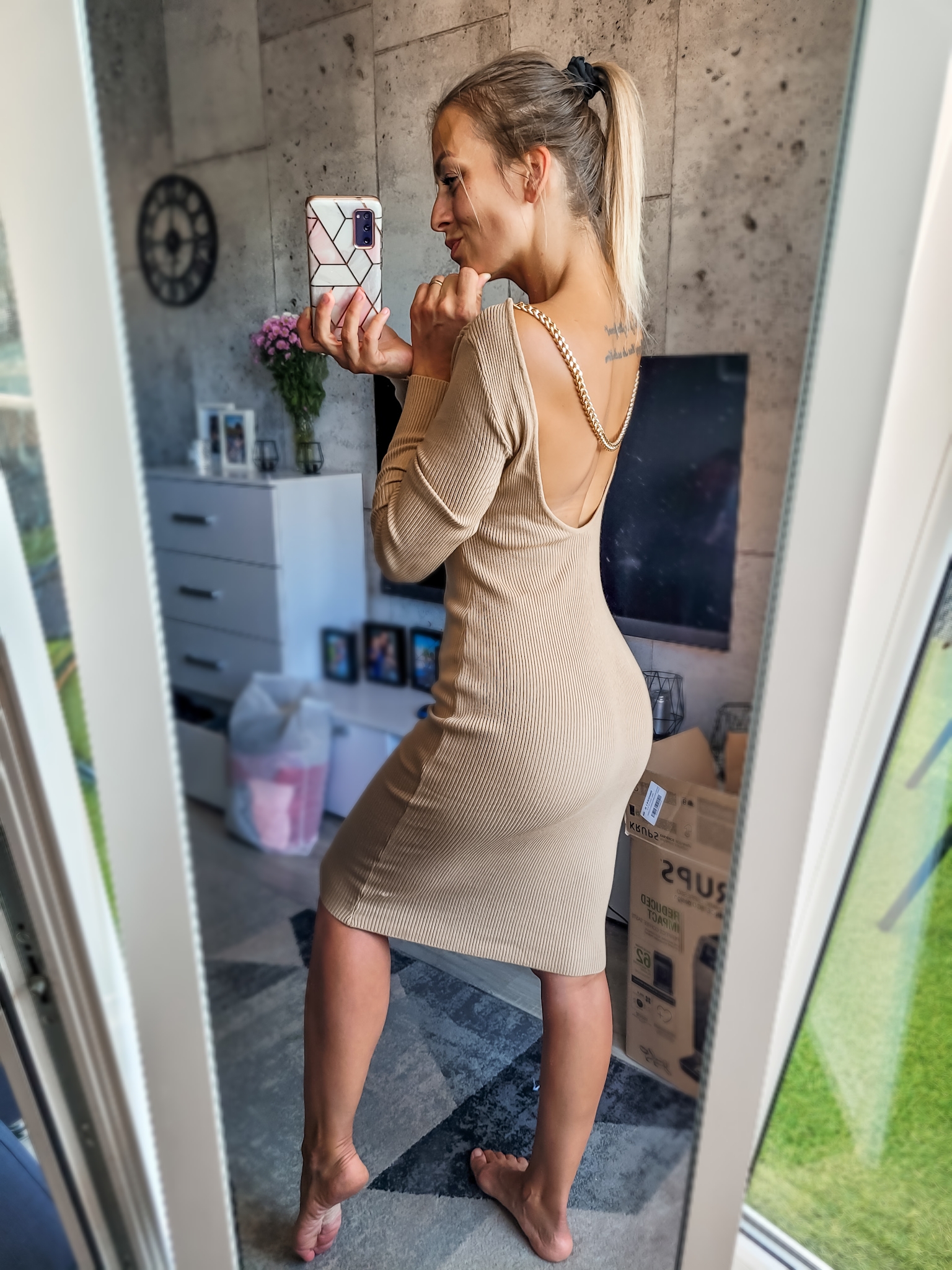 Sukienka posiada efektowne wycięcie na plecach które zdobi łańcuszek w pięknym złotym kolorze. Sukienka uszyta z prążkowanego materiału który jest bardzo elastyczny i przyjemny w dotyku.